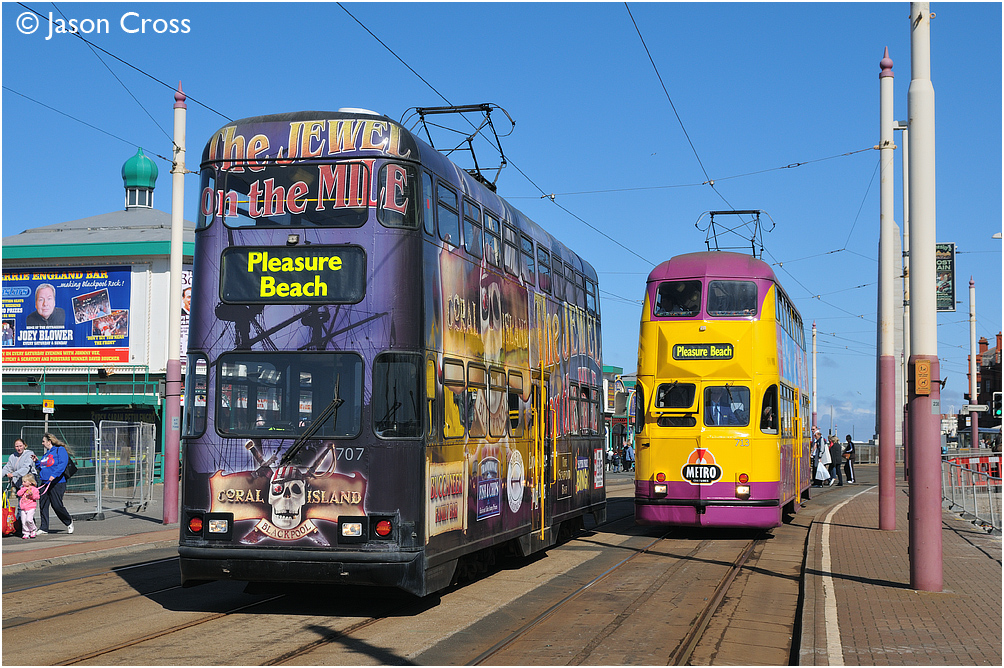 713 returns from the Cabin as 707 reverses on the centre track at North Pier having just come from depot to take up duty on specials. Date: 11 April 2009 Manipulation Notes: None