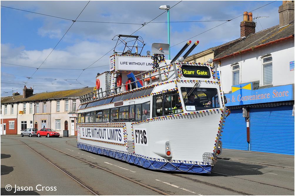 A shortage of available trams saw illuminated frigate F736 on Fleetwood service. In this view it is on North Albert Street in Fleetwood while working a Fleetwood to Starr Gate service. Date: 16 May 2009 Manipulation Notes: None