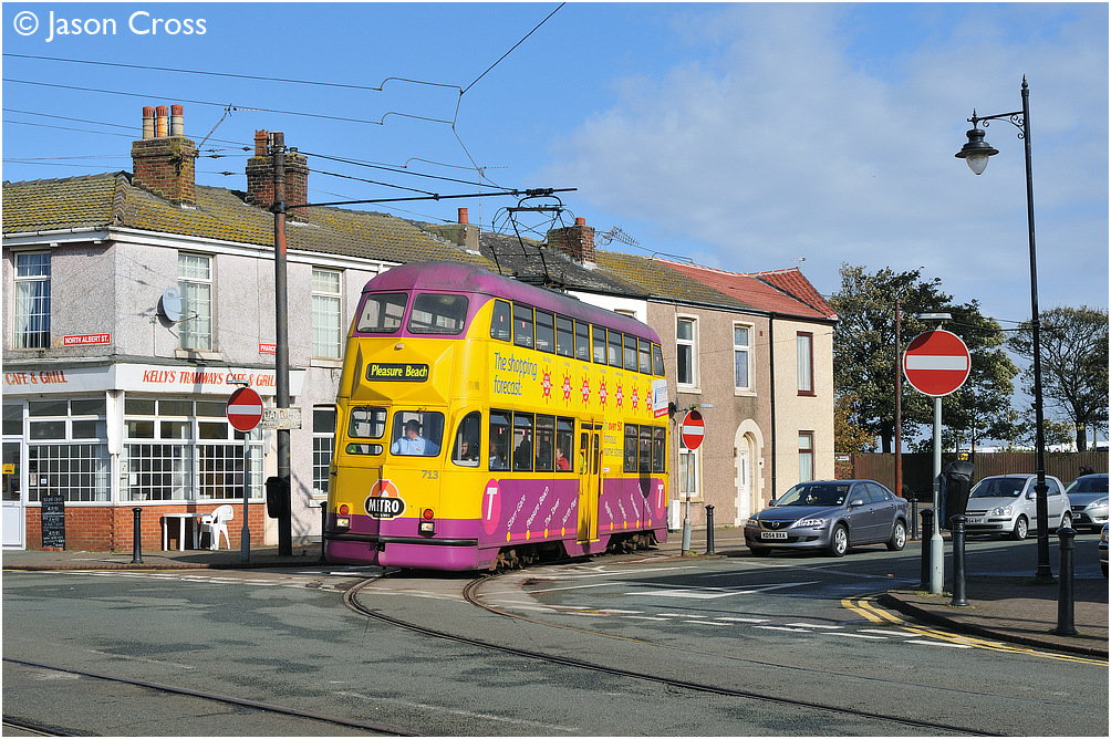713 exits Pharos Street in Fleetwood while working a Fleetwood to Pleasure Beach special. Date: 3 October 2009 Manipulation Notes: None