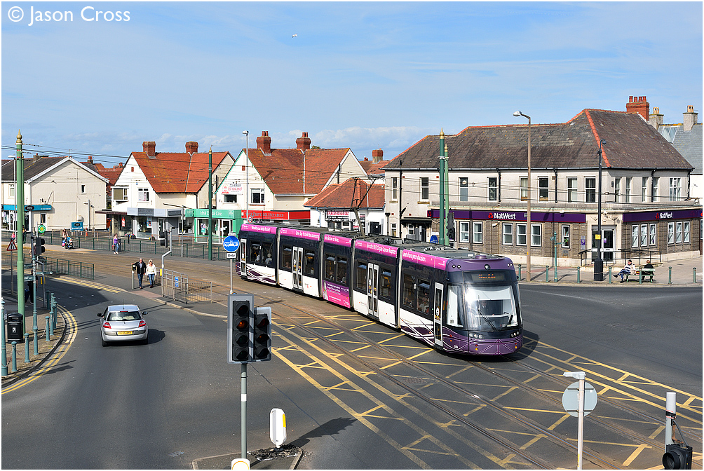 009 departs from Cleveleys with a Fleetwood Fisherman's Walk to Starr Gate service. Date: 16 July 2017 Manipulation Notes: None Camera mounted on a tall pole and remotely fired