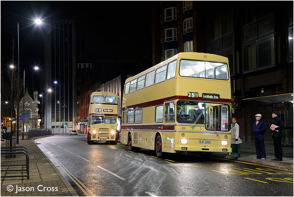 Scania Metropolitan 301 and Leyland PD3 number 48 on Humberstone Gate, Leicester EMRPS photo shoot. Date: 11 January 2015 Manipulation Notes: None