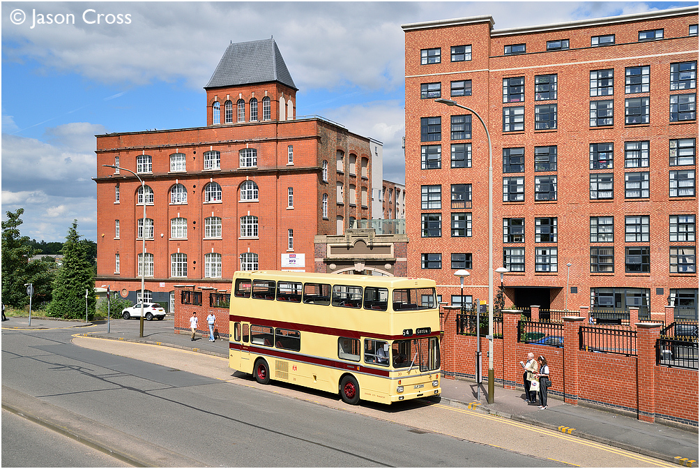 Scania Metropolitan 301 poses as a 54 service on Abbey Park Road. EMRPS / LTHT Leicester City Transport bus photo shoot. Date: 13 August 2017 Manipulation Notes: None Camera mounted on a tall pole and remotely fired