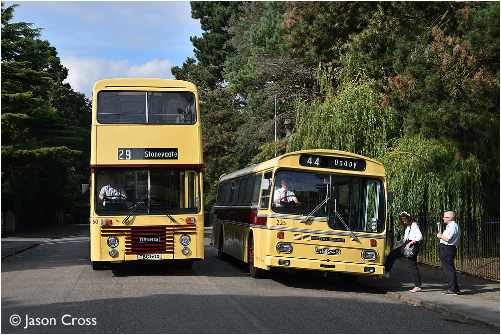 225 is overtaken by 50 in Glebe Road, Stoneygate. EMRPS / LTHT Leicester City Transport bus photo shoot. Date: 13 August 2017 Manipulation Notes: None