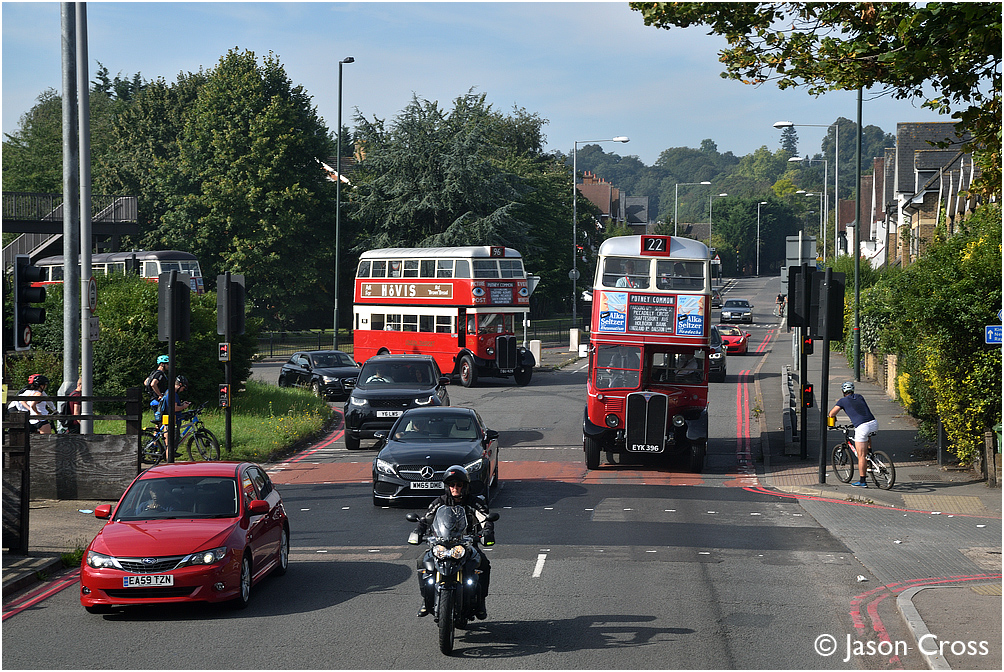 RT1 and STL2377 in the traffic at Kingston Vale. RT1's 80th birthday road trip. Date: 24 August 2019 Manipulation Notes: None