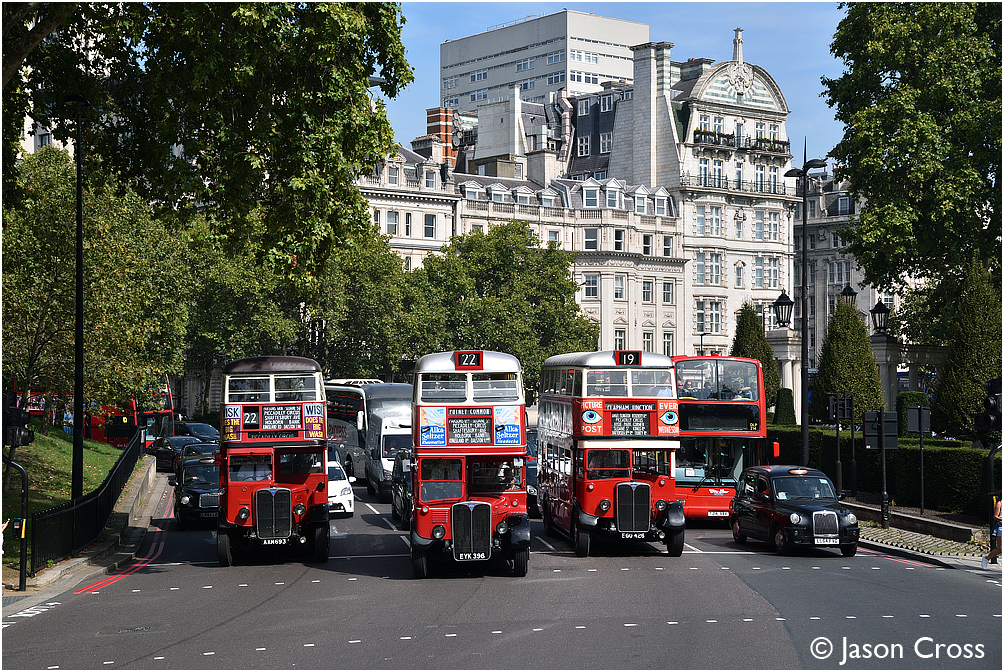 STL441, RT1 and STL2377 make their way through Duke of Wellington Place in London. RT1's 80th birthday road trip. Date: 24 August 2019 Manipulation Notes: None