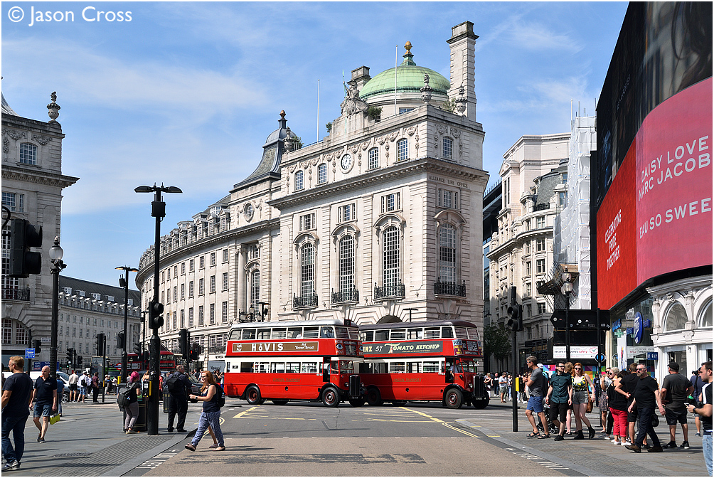 STL441 and STL2377 pass through Piccadilly Circus in London. RT1's 80th birthday road trip. Date: 24 August 2019 Manipulation Notes: None