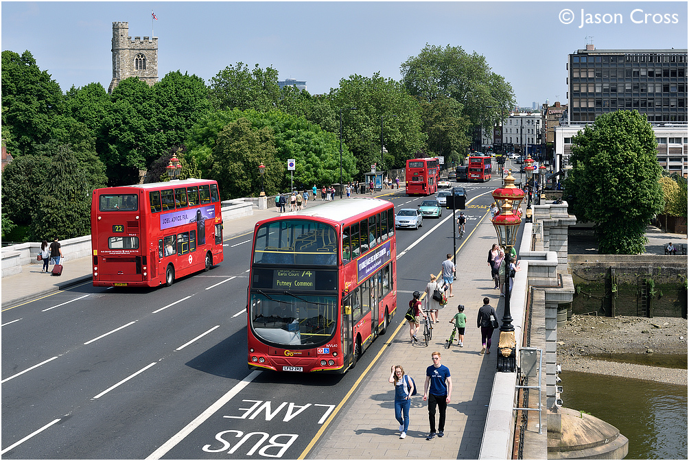 A street scene on Putney Bridge with WVL40 and PVL413. Date: 6 June 2016 Manipulation Notes: None Camera mounted on a tall pole and remotely fired