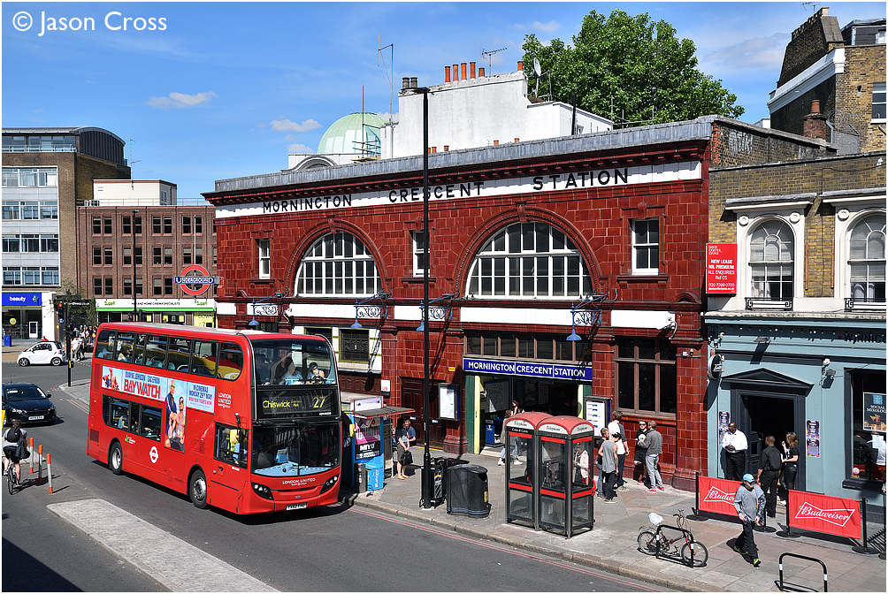 ADH45030 passes Mornington Crescent station with a 27 for Chiswick. Date: 3 June 2017 Manipulation Notes: None Camera mounted on a tall pole and remotely fired