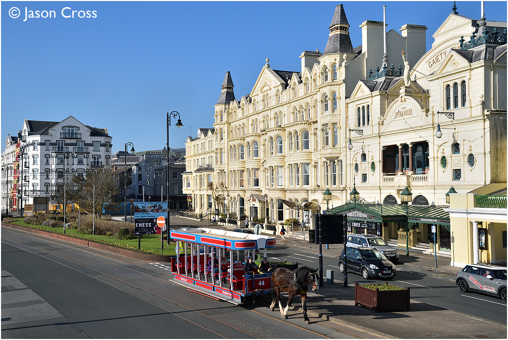 Steve and car 44 on Harris Promenade with the 0900 Sea Terminal to Derby Castle service. Date: 21 April 2018 Manipulation Notes: None Camera mounted on a tall pole and remotely fired
