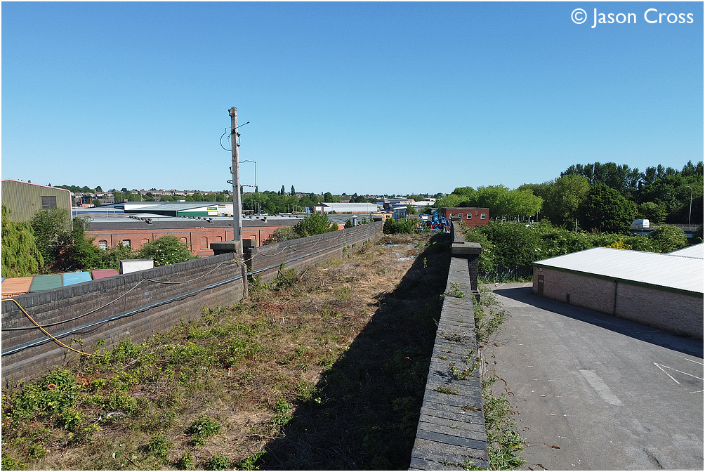 Section of the former Great Central Railway between Slater Street and the River Soar in Leicester. Note the old wooden signal post. Date: 25 May 2020 Manipulation Notes: None Photo taken from a drone