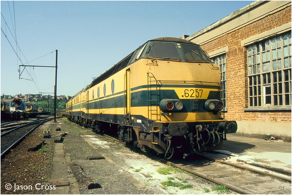 Although parked amongst the withdrawn locos on Ronet depot, class 62 6257 was awaiting attention and saw further use. Date: 16 May 1992