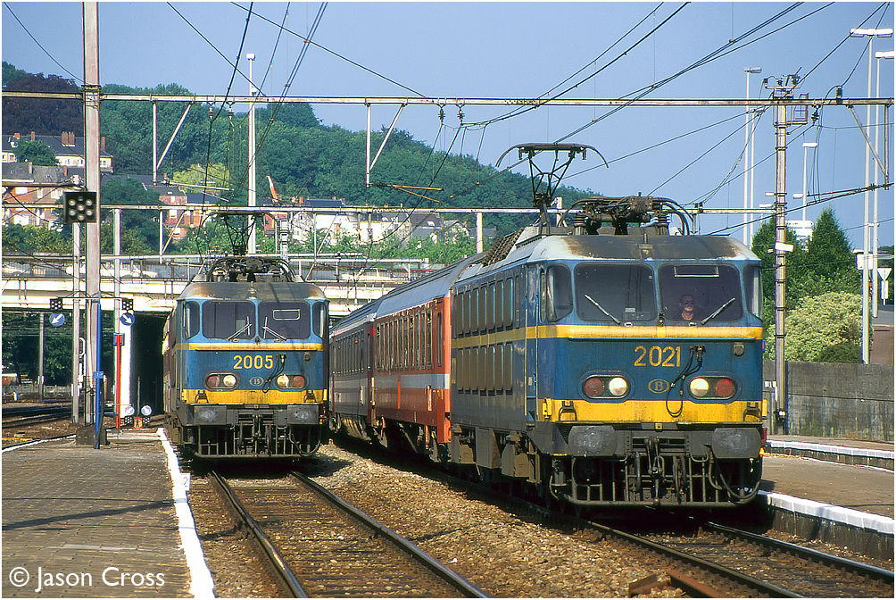 Namur station with 2005 bringing in some empty stock to form a working to Antwerp and 2021 arriving with an international train from Italy which it would have worked from Luxembourg. Date: 7 July 1995
