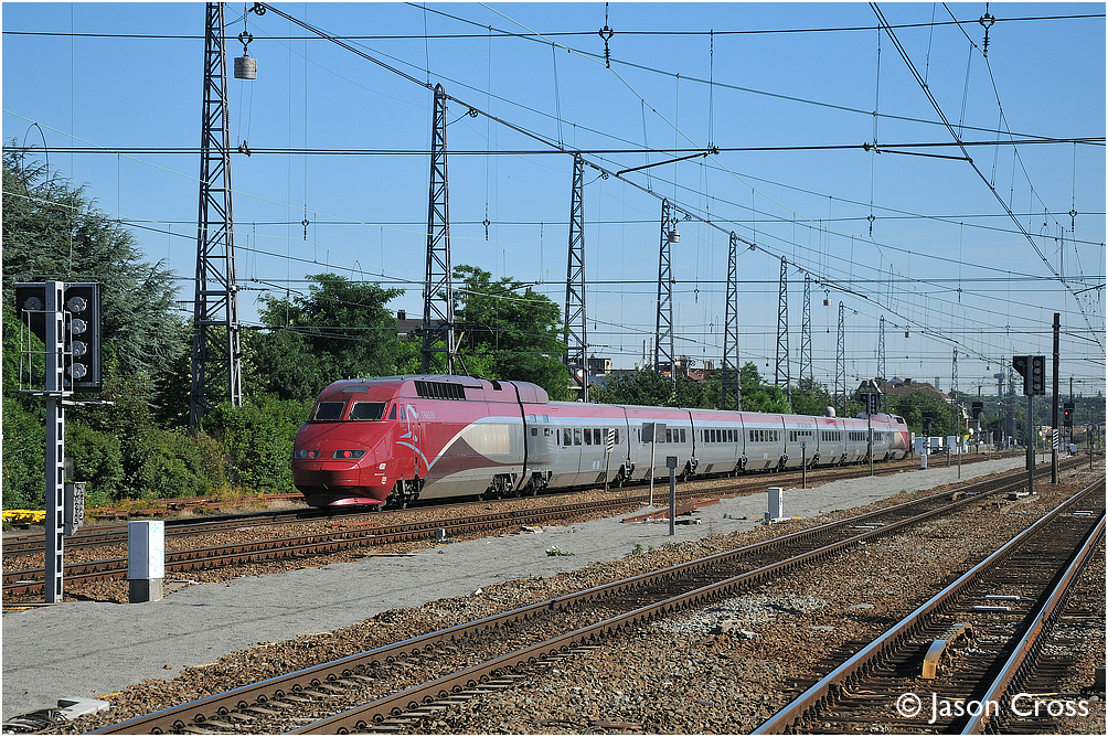 Thalys TGV 4532 leaves Brussel Noord with train THA9315 0825 Paris Nord to Amsterdam CS. Date: 1 August 2012 Manipulation Notes: None