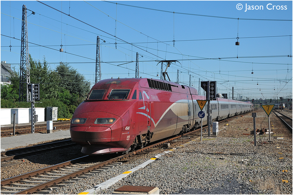 4540 arrives at Brussel Noord with train THA9422 0948 Brussels Airport to Brussels Midi (to join train THA9322 for Paris Nord). Date: 1 August 2012 Manipulation Notes: None