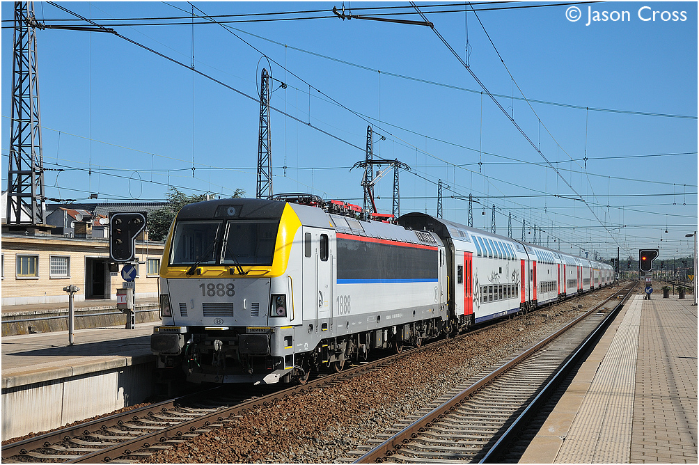 1888 pushes train IC2209 0908 Gent St Pieters to Genk away from Brussel Noord. Date: 1 August 2012 Manipulation Notes: None