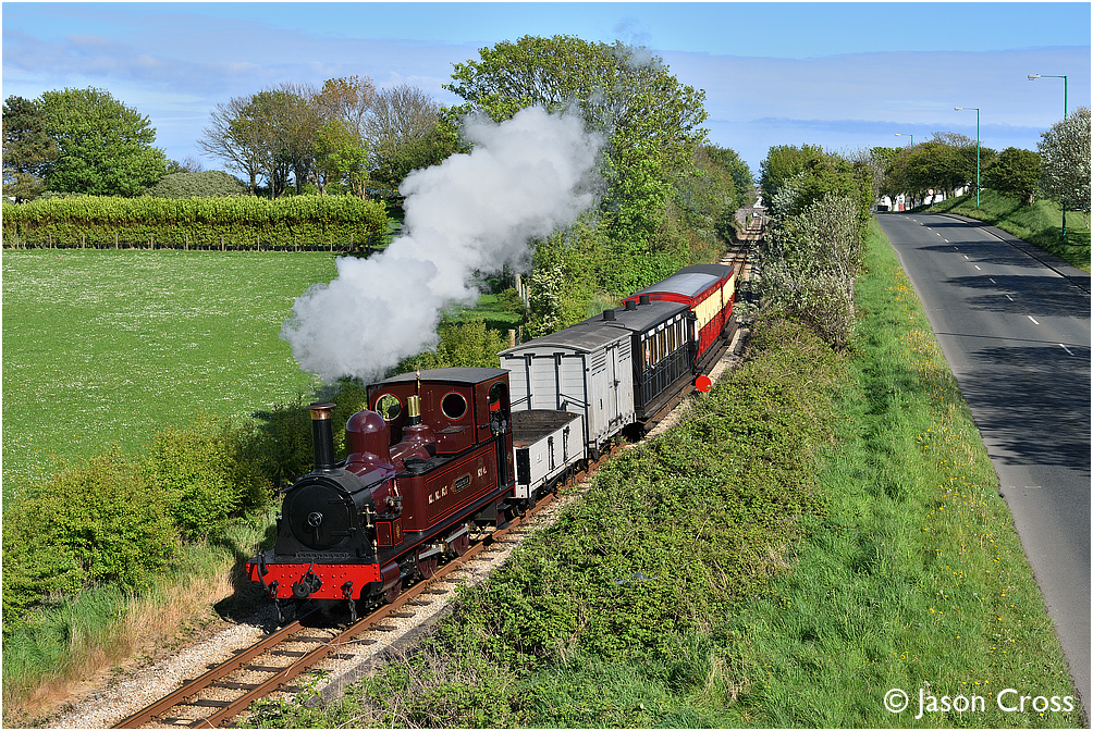 MNR No.4 'Caledonia' powers away from Castletown. David Williams photo charter. Date: 1 May 2019 Manipulation Notes: None Camera mounted on a tall pole and remotely fired