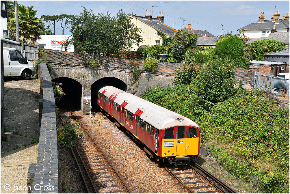483006 emerges from Ryde Tunnel with the 2D31 1307 Ryde Pier Head to Shanklin service. Date: 4 August 2019 Manipulation Notes: None Camera mounted on a tall pole and remotely fired