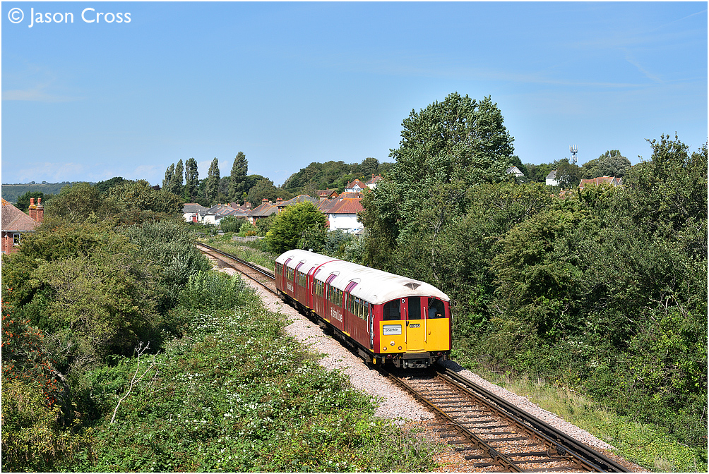 483008 approaches Lake while working the 2D37 1449 Ryde Pier Head to Shanklin. Date: 5 August 2019 Manipulation Notes: None Camera mounted on a tall pole and remotely fired