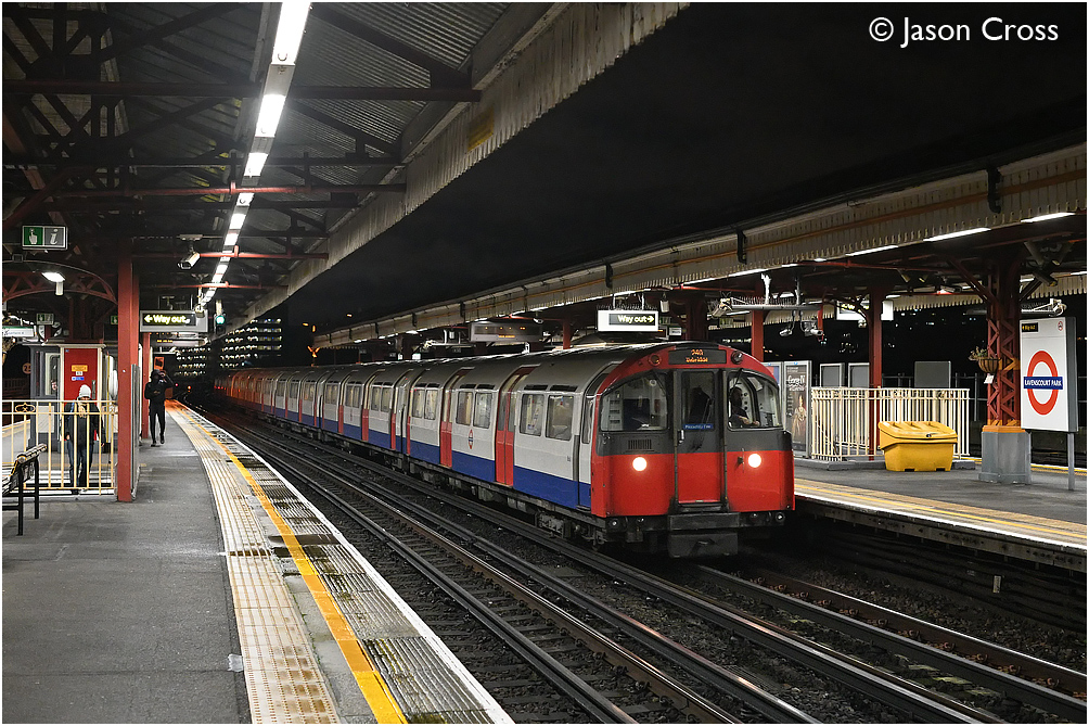 Double ended 1973 Tube Stock unit 868-668-869 leads an Uxbridge bound Piccadilly Line service through Ravenscourt Park. Date: 31 January 2020 Manipulation Notes: None