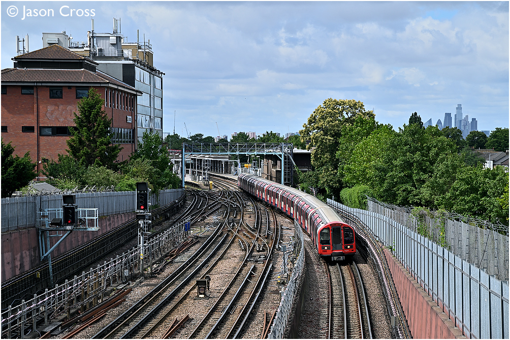 A Central Line service for Hainault (via Newbury Park) departs from Leytonstone led by 91277. Date: 28 June 2020 Manipulation Notes: None