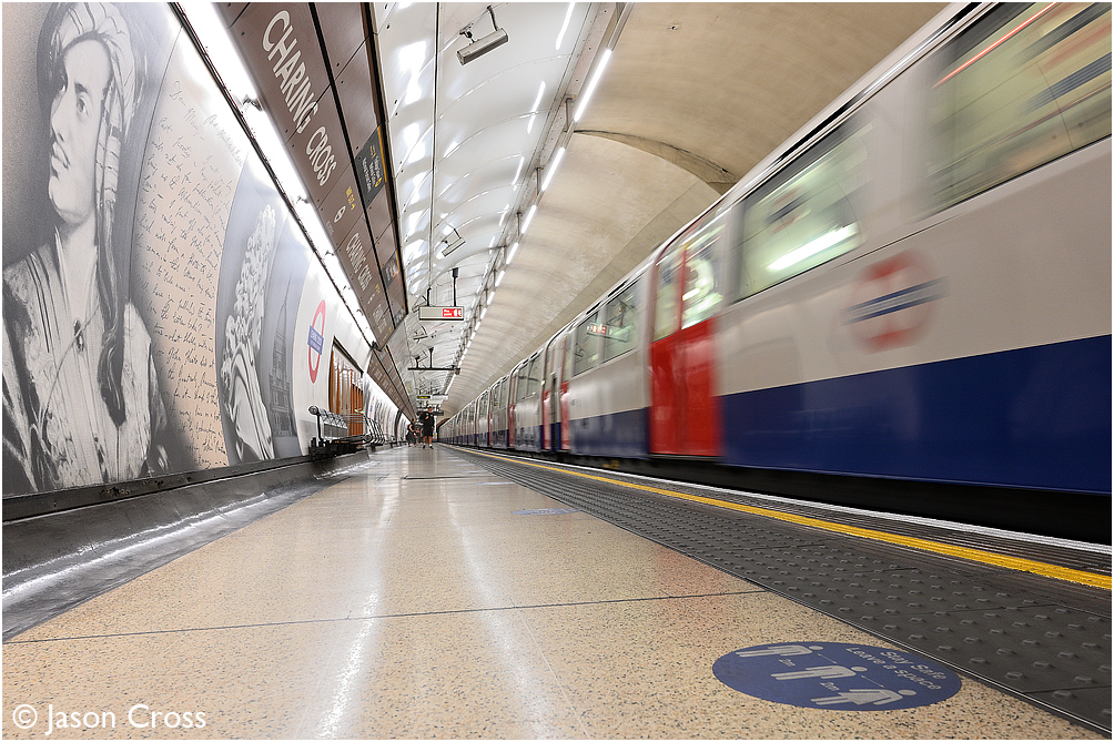 'Stay Safe, Leave a Space'. Charing Cross, northbound Bakerloo Line. Date: 16 August 2020 Manipulation Notes: None