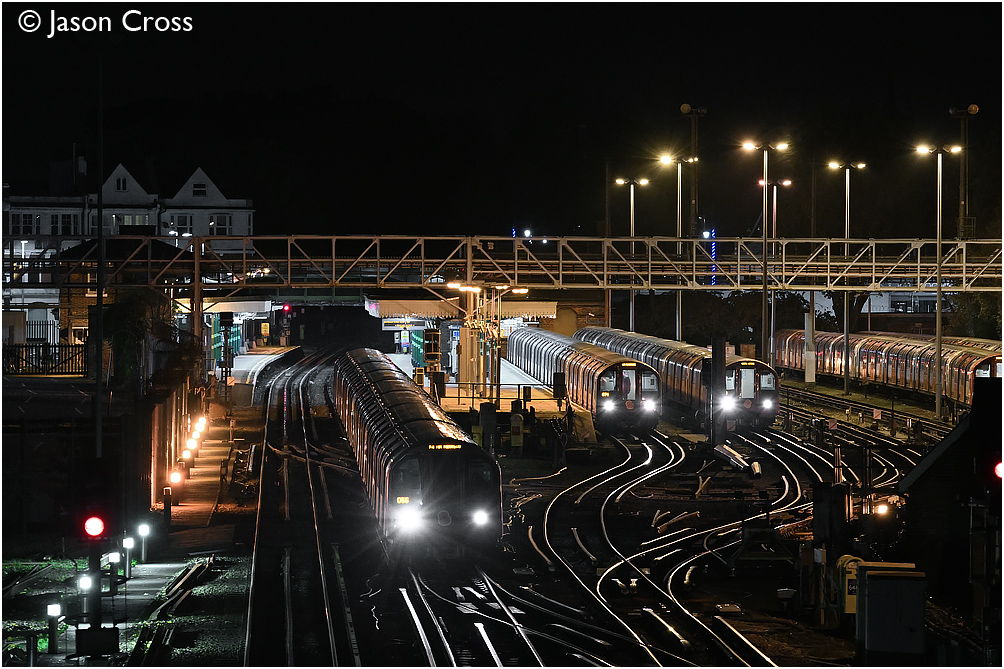 Woodford at the start of traffic with a train of 1992 Tube Stock departing with a Loughton to Ealing Broadway Central Line service. Date: 1 November 2020 Manipulation Notes: None
