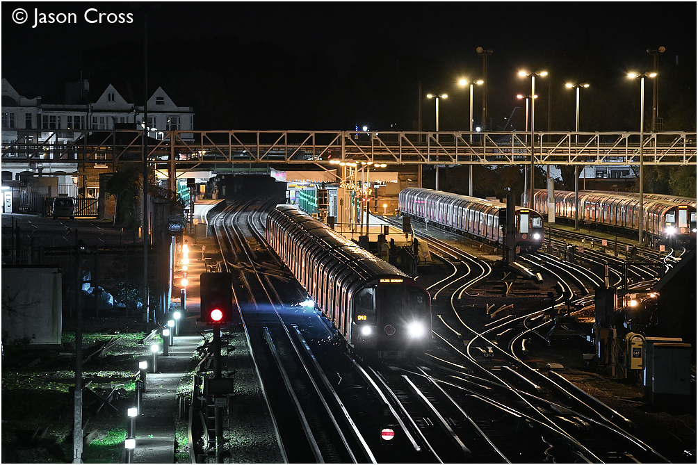 Woodford at the start of traffic with a train of 1992 Tube Stock led by 91113 departing with a Loughton to Ealing Broadway service. Date: 1 November 2020 Manipulation Notes: None