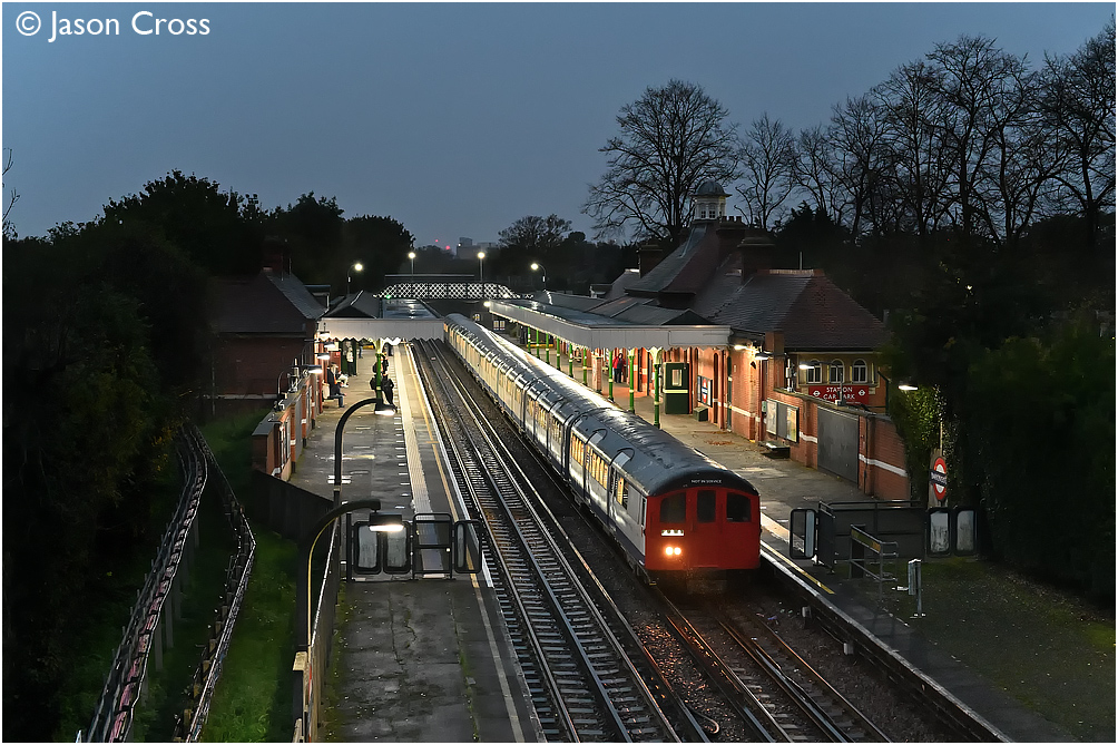 The Rail Adhesion Train passes through Barkingside at dawn on the last leg of its morning tour from Newbury Park to Hainault Depot. Date: 1 November 2020 Manipulation Notes: None