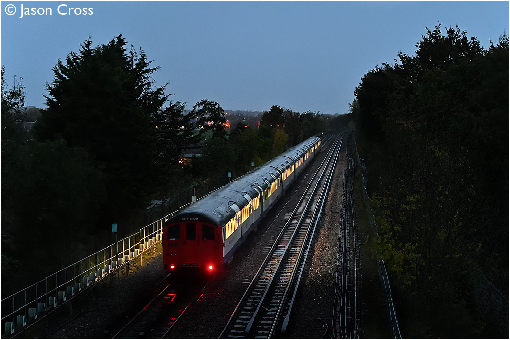 The Rail Adhesion Train passes through Barkingside at dawn on the last leg of its morning tour from Newbury Park to Hainault Depot. Date: 1 November 2020 Manipulation Notes: None
