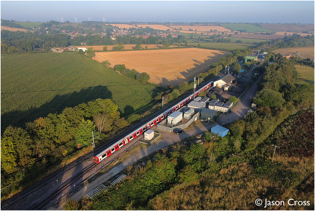 1992 Tube Stock 91111-92111+92446-93446+93222-92222+92263-91263 stabled at Old Dalby in Leicestershire during the testing of AC traction motors. Date: 8 September 2021 Manipulation Notes: None Photo taken from a drone