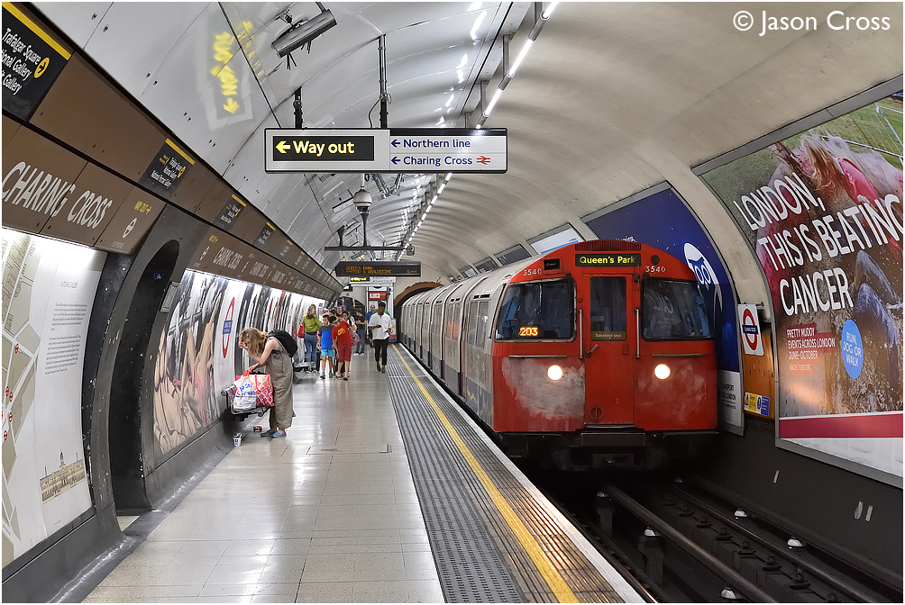 A train of 1972 Tube Stock led by 3540 arrives at Charing Cross with an Elephant & Castle to Queen's Park Bakerloo Line service. Date: 22 July 2018 Manipulation Notes: None