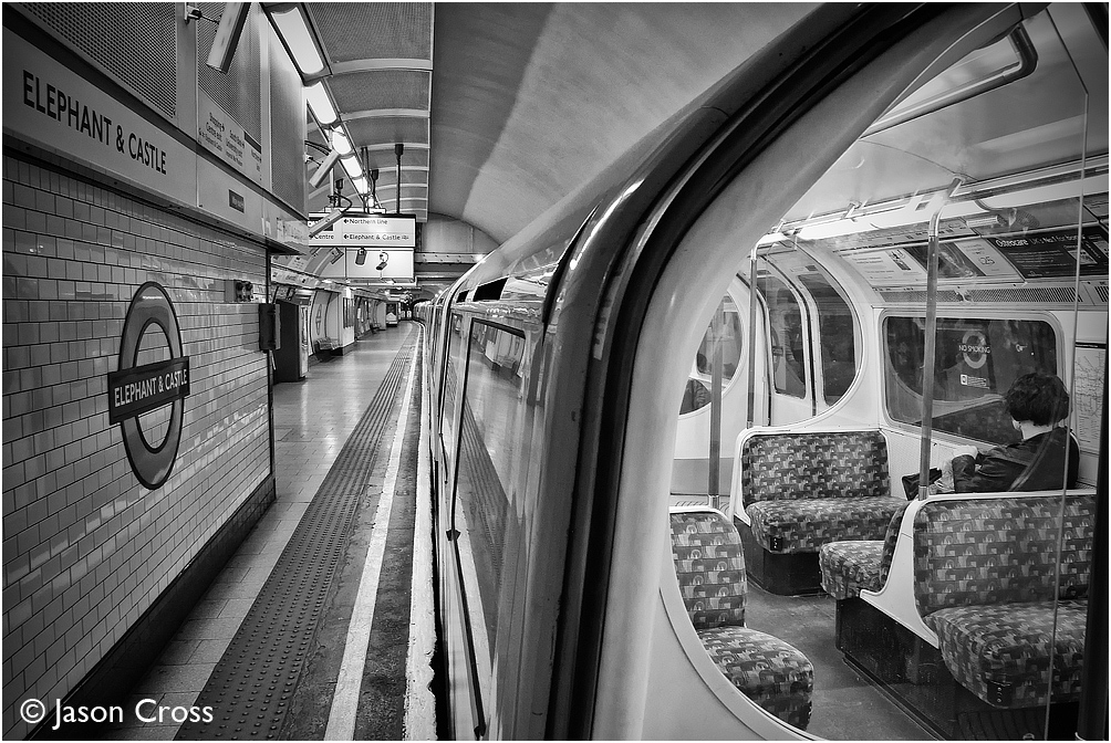 A lone passenger waits for her train to depart from Elephant & Castle on the Bakerloo Line. Date: 20 October 2019 Manipulation Notes: None