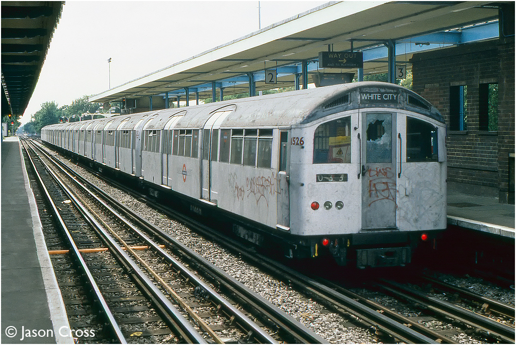 Central Line 1962 Stock Driving Motor 1526 appears to have suffered a direct hit from something solid and is about to reverse in the platform at Hainault to go onto Hainault Depot. Date: 25 July 1992 Manipulation Notes: None