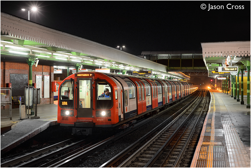 A train of Central Line 1992 Stock reverses in platform 2 at Woodford and forms a service for Hainault. Date: 9 November 2013 Manipulation Notes: None