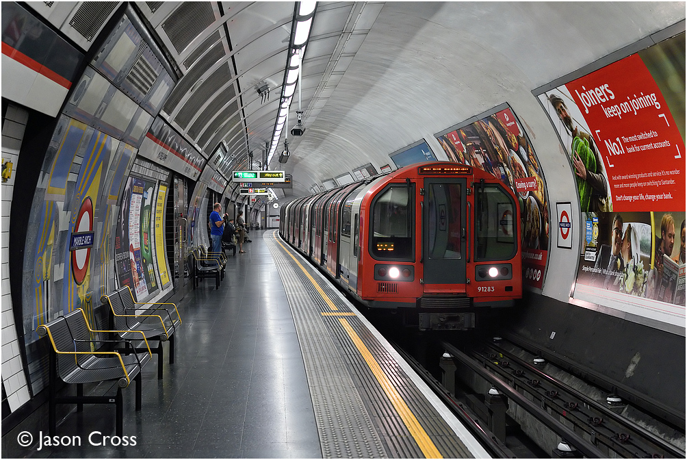 91283 leads a westbound Central Line service at Marble Arch. Date: 18 October 2015 Manipulation Notes: None