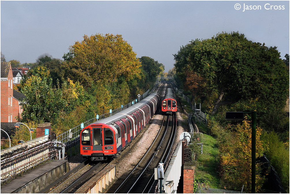 Central Line 1992 Stock trains passing at Snaresbrook. Date: 31 October 2015 Manipulation Notes: None