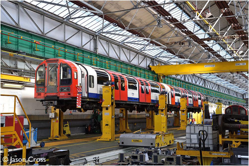 1992 Stock 91331-92331 up in the air inside Ruislip Depot. Photo taken with permission during an officially authorised visit. Date: 8 April 2017 Manipulation Notes: None Camera mounted on a tall pole and remotely fired