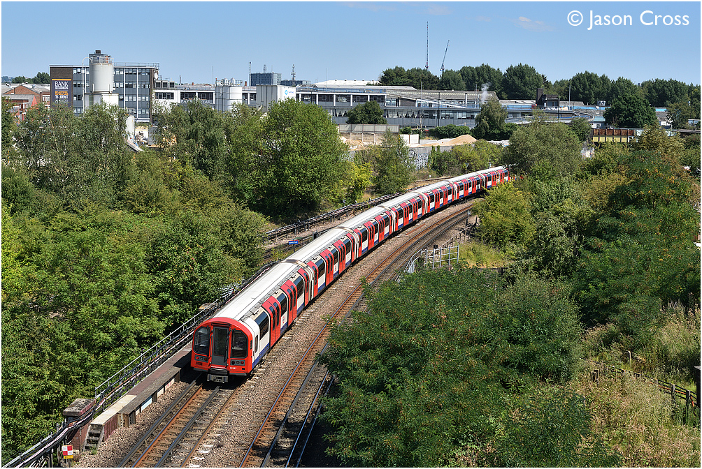 91197 brings up the rear of an Ealing Broadway to Woodford via Hainault Central Line service as it approaches North Acton Junction. Date: 5 August 2018 Manipulation Notes: None Camera mounted on a tall pole and remotely fired