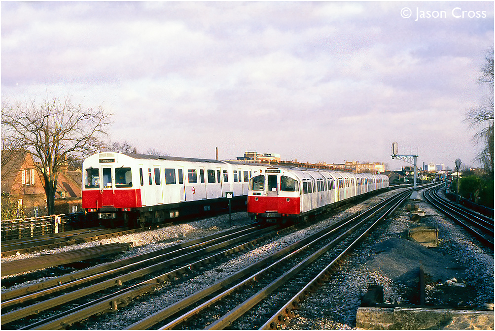 A train of Piccadilly Line 1973 Stock overtakes a train of District Line D Stock at Turnham Green. Date: 10 December 1988 Manipulation Notes: None
