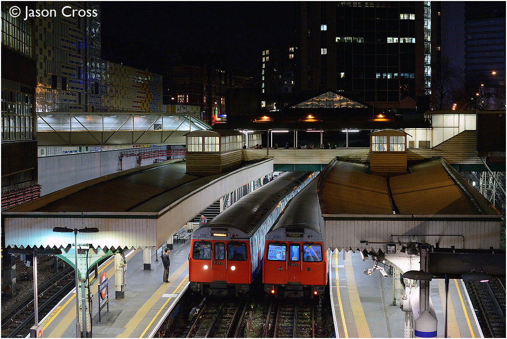 5707 has just arrived at Edgware Road with a District Line service from Wimbledon and comes alongside 5543 which is about to work a Circle Line service to Hammersmith (via Aldgate). Date: 4 January 2014 Manipulation Notes: None