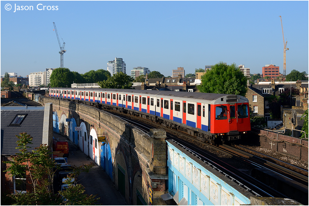 7003 passes through Putney and climbs up onto the Fulham Rail Bridge with a Wimbledon to South Kensington District Line service. Date: 31 May 2014 Manipulation Notes: None Camera mounted on a tall pole and remotely fired