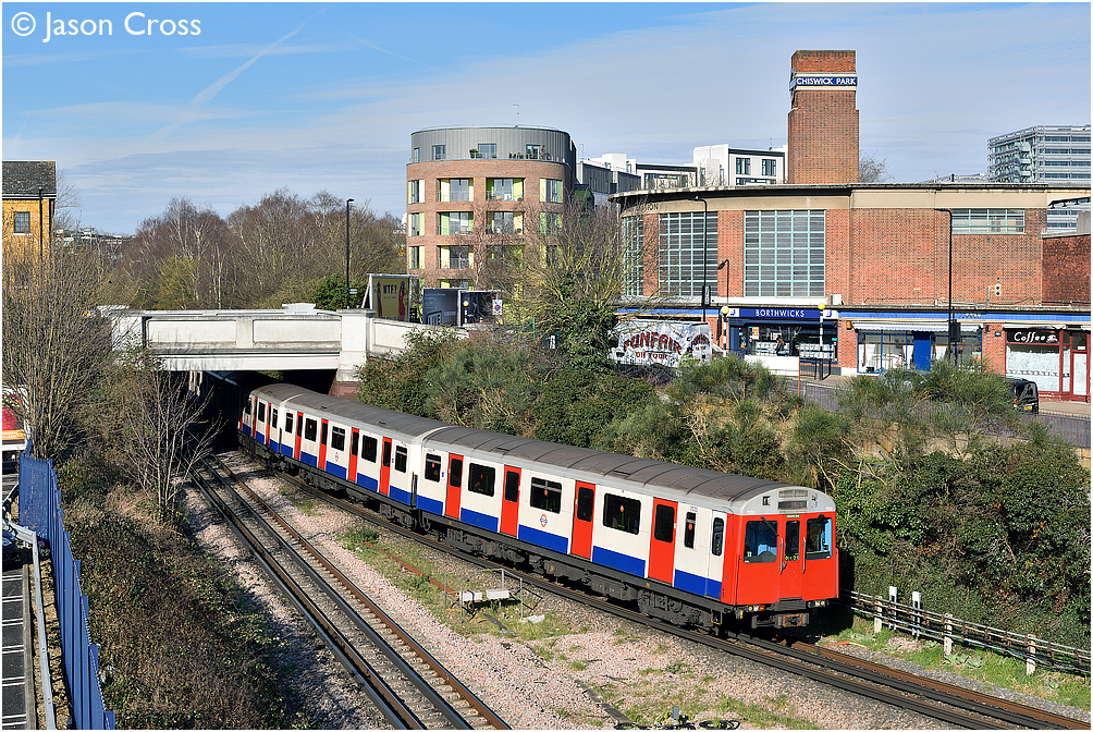 7535 passes in front of Chiswick Park station as it heads towards Turnham Green