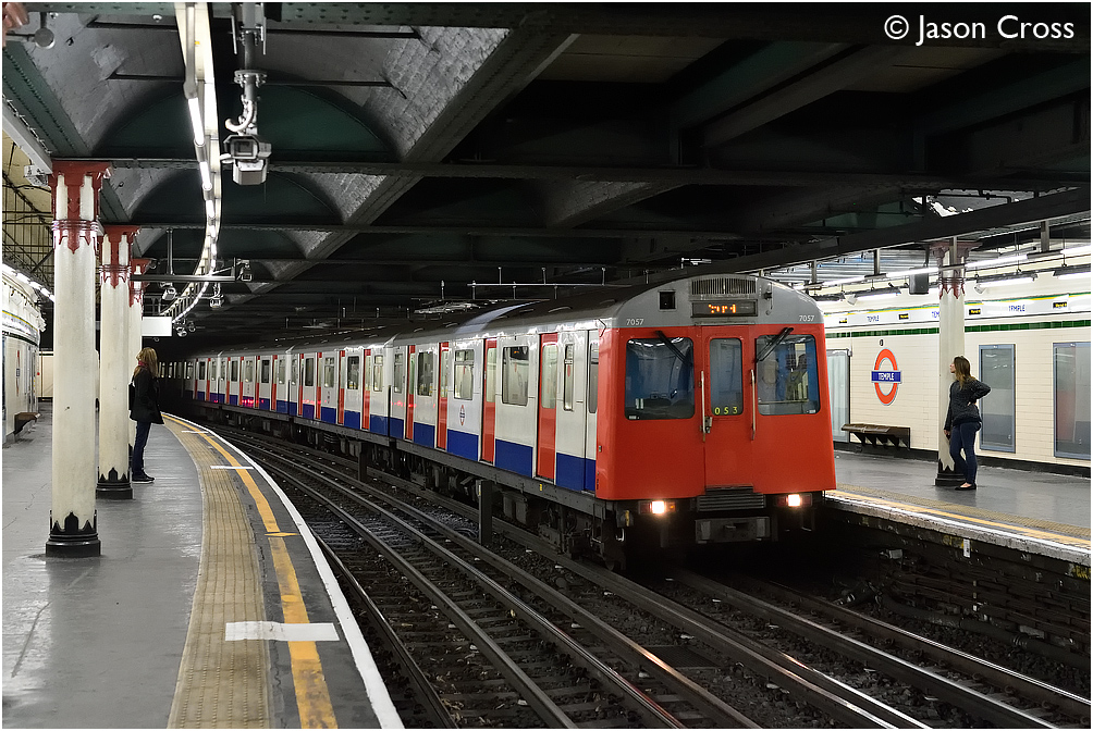 7057 leads train 53, the 1343 Wimbledon to Tower Hill District Line service into Temple. Date: 22 October 2016 Manipulation Notes: None