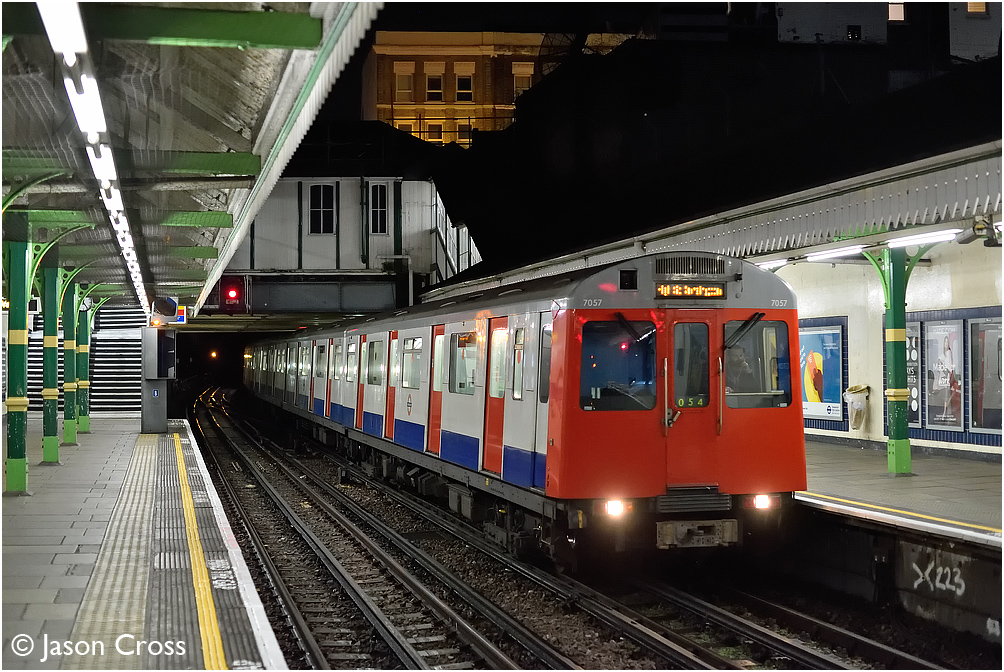 7057 leads train 54, the 0000 Ealing Broadway to High Street Kensington into West Kensington. Date: 4 March 2017 Manipulation Notes: None