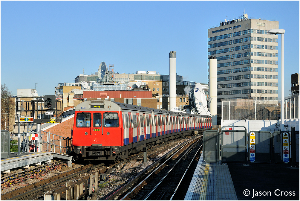 A rear view of a train of C Stock departing from Wood Lane with a Hammersmith to Barking service on the Hammersmith & City Line. Date: 11 January 2012 Manipulation Notes: None