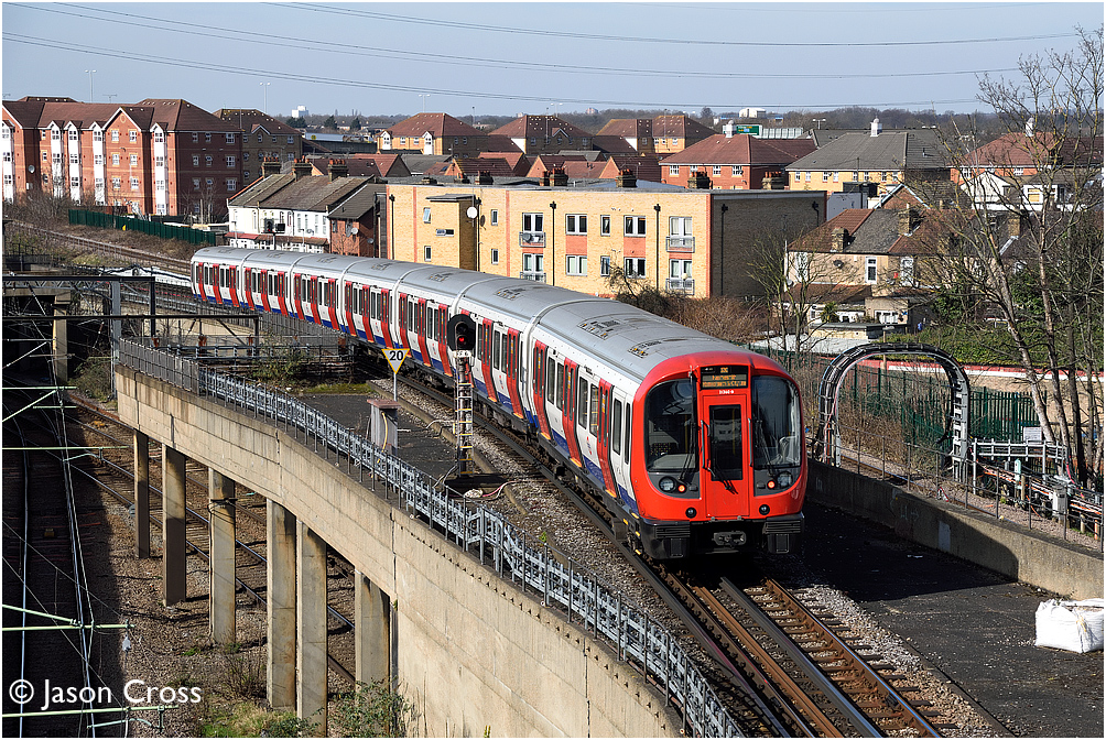 21360 negotiates the Barking flyover with a Barking to Hammersmith service. Date: 7 March 2015 Manipulation Notes: None Camera mounted on a tall pole and remotely fired