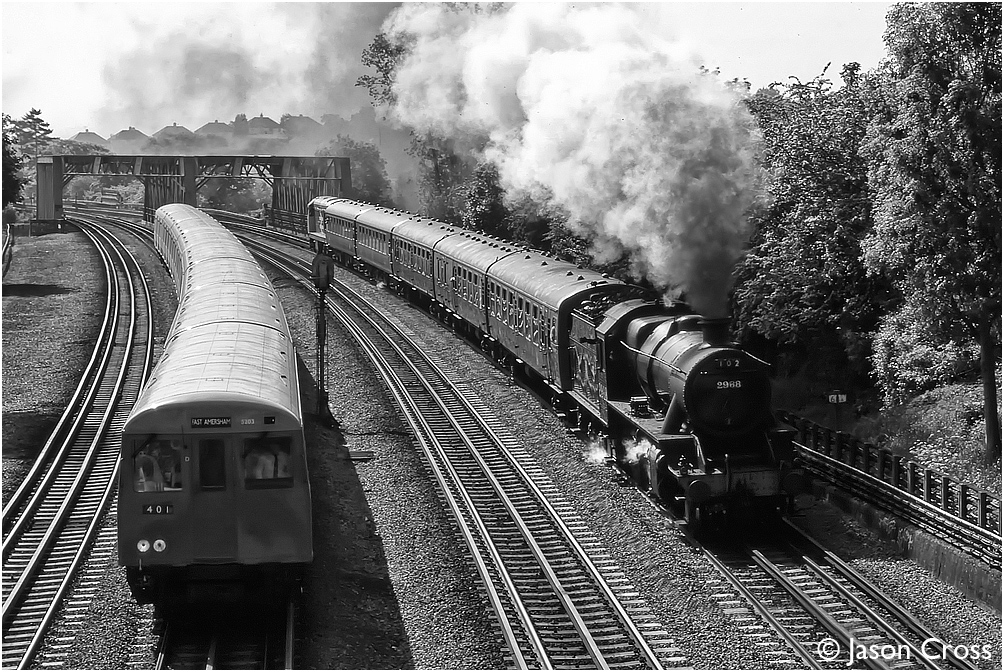 2968 approaches Northwood with a Harrow on the Hill to Amersham working and is being overtaken by a train of A Stock. 'Steam on the Met' 1998. Date: 16 May 1998 Manipulation Notes: None