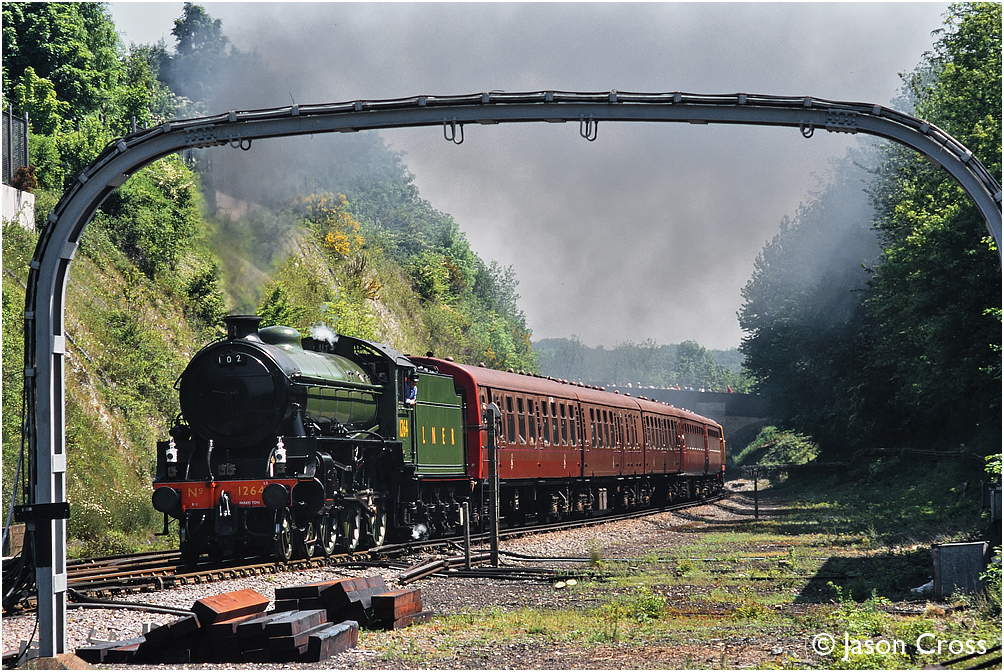 1264 tackles the climb through Chorleywood with a Watford to Amersham train. 'Steam on the Met' 1998. Date: 16 May 1998 Manipulation Notes: None