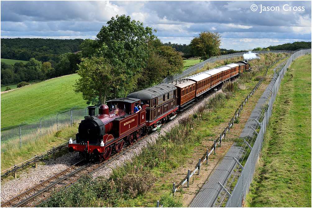 Met 1 and 'Sarah Siddons' lead a Watford to Chesham special at Quill Hall Farm on the Chesham branch. Date: 12 September 2015 Manipulation Notes: None Camera mounted on a tall pole and remotely fired