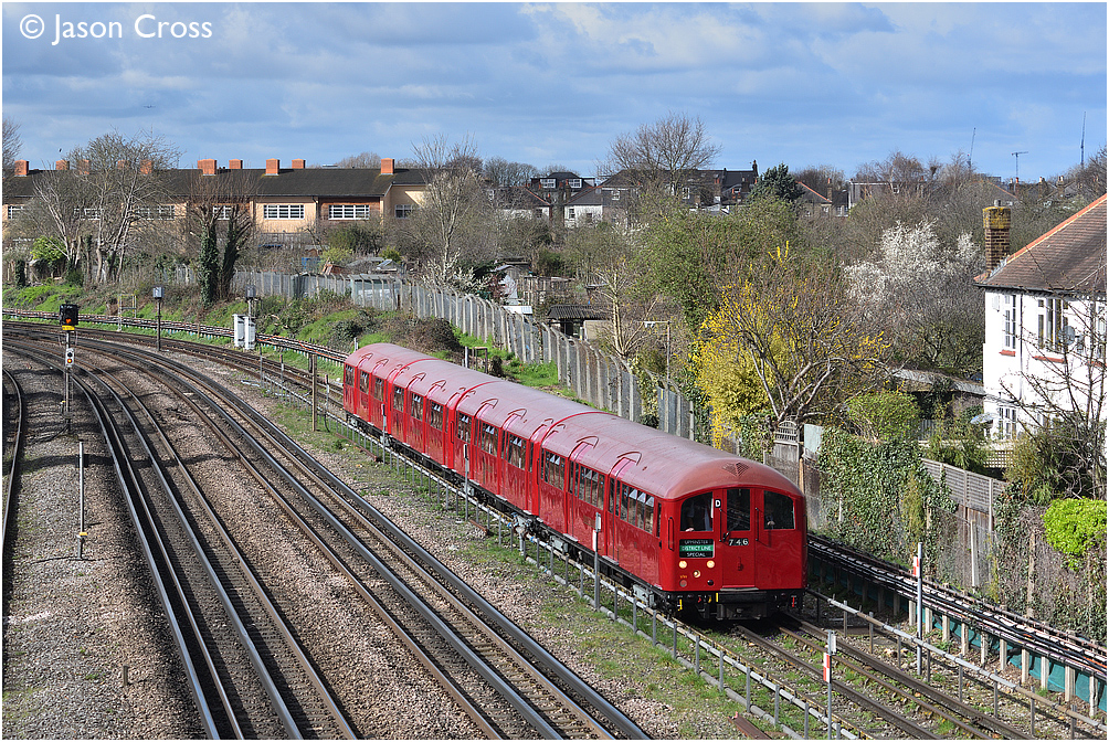 The 1938 Tube Stock heritage train 11012-12048-012256-10012 runs along the eastbound local between South Ealing and Acton Town while working a Northfields to Upminster tour. Date: 17 March 2019 Manipulation Notes: None